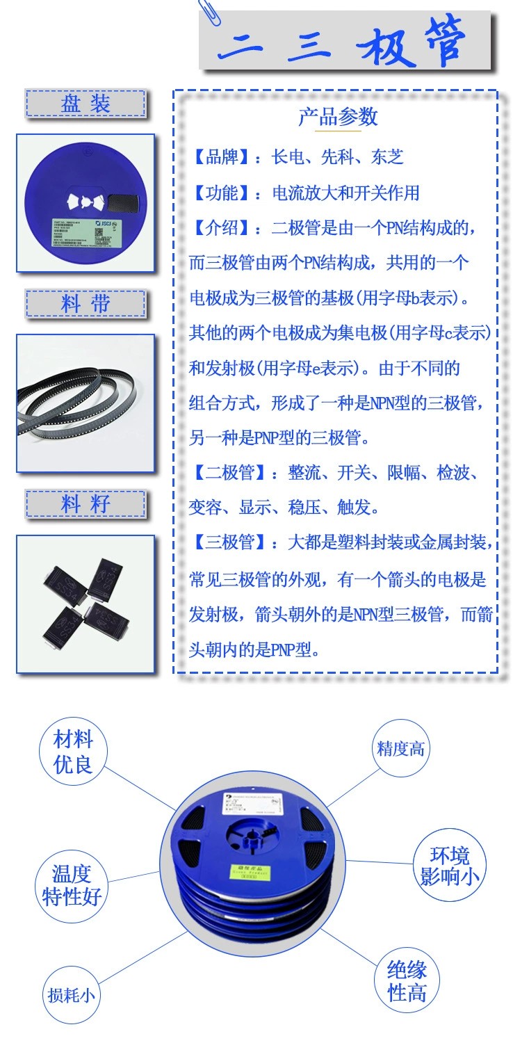 貼片三極管基本作用是放大,它可以把微弱的電信號放大到一定強度,當(dāng)然這種轉(zhuǎn)換仍然遵循能量守恒,它只是把電源的能量轉(zhuǎn)換成信號的能量罷了。